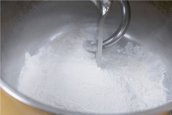 計量した材料をミキサーでミキシングします。 低速で材料を均一に混ぜ合わせたあと、高速で生地を捏ねていきます。 毎日、毎回、温度や湿度に左右される仕上がりを、人の感覚でチェックし、 成型工程や発酵がうまくいくよう、生地作りをしています。